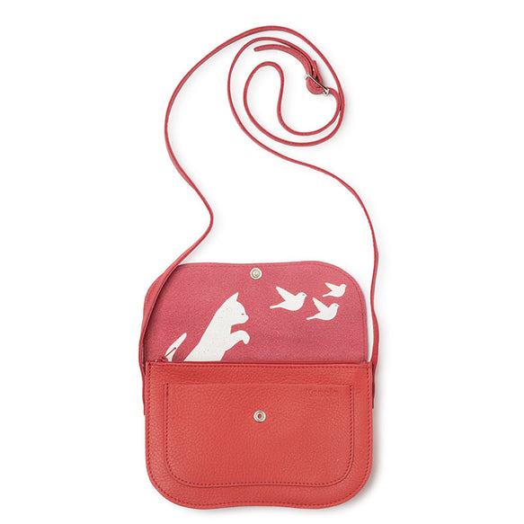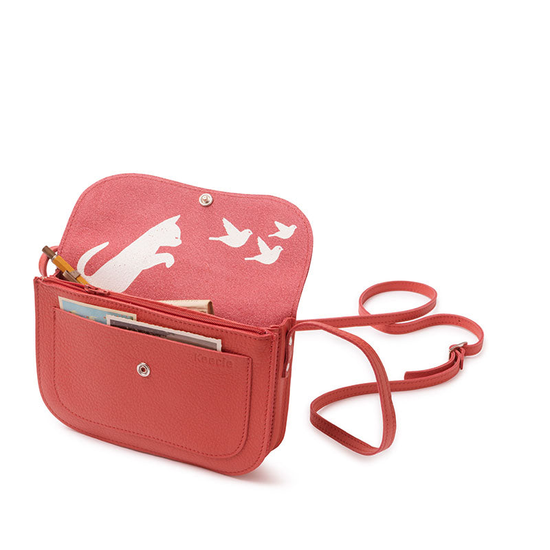 Dit is een tas waar je jarenlang plezier van zult hebben. Gemaakt van duurzaam Italiaans leer dat zo is behandeld dat het weinig onderhoud nodig heeft. Daarnaast kan het goed tegen de regen. Het water loopt zo van je tas af. De zeefdruk aan de binnenkant is geïnspireerd op Moos, de Keecie-kat, die overigens gelukkig niet dol is op vogeltjes. Dezelfde print vind je in onze Cat Chase portemonnees. Kijk bij de details voor de link.