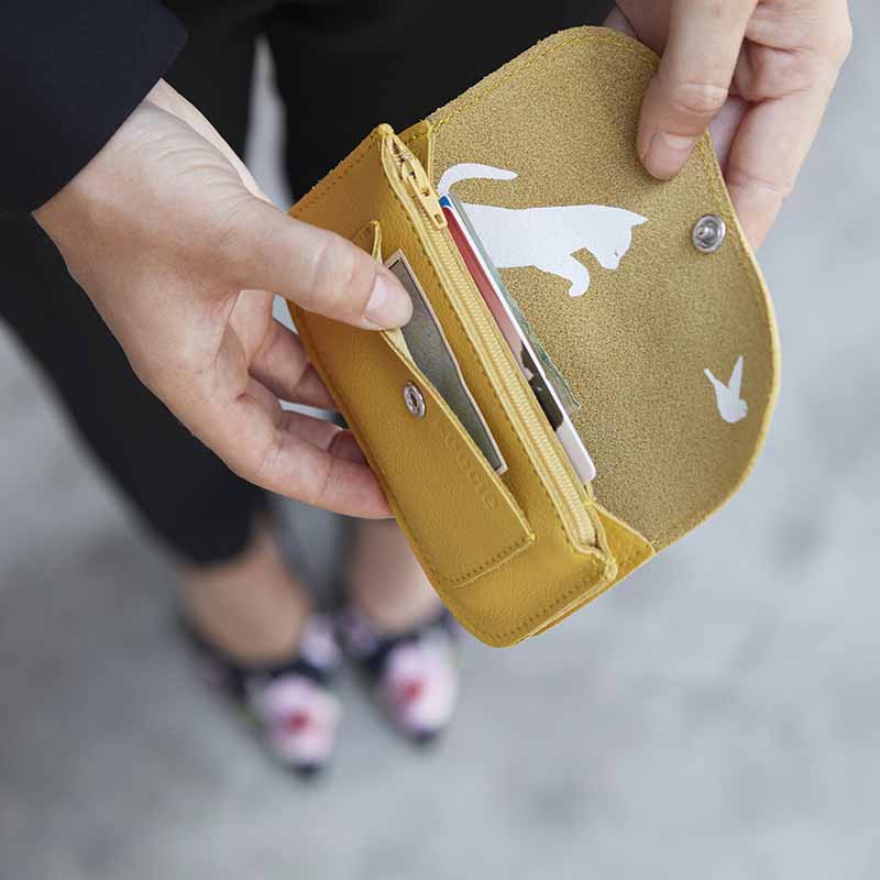Ben je zo iemand die van alles in haar portemonnee bewaart? Het toegangsbewijs van een mooie tentoonstelling waar je geweest bent, pasfoto’s, een oude post-it met een lief berichtje... Nee? Dan is de Cat Chase small echt iets voor jou. Deze gele leren portemonnee heeft precies voldoende vakjes om je briefgeld, muntgeld, rijbewijs en bankpas in op te bergen. Omdat je eigenlijk verder niets nodig hebt.