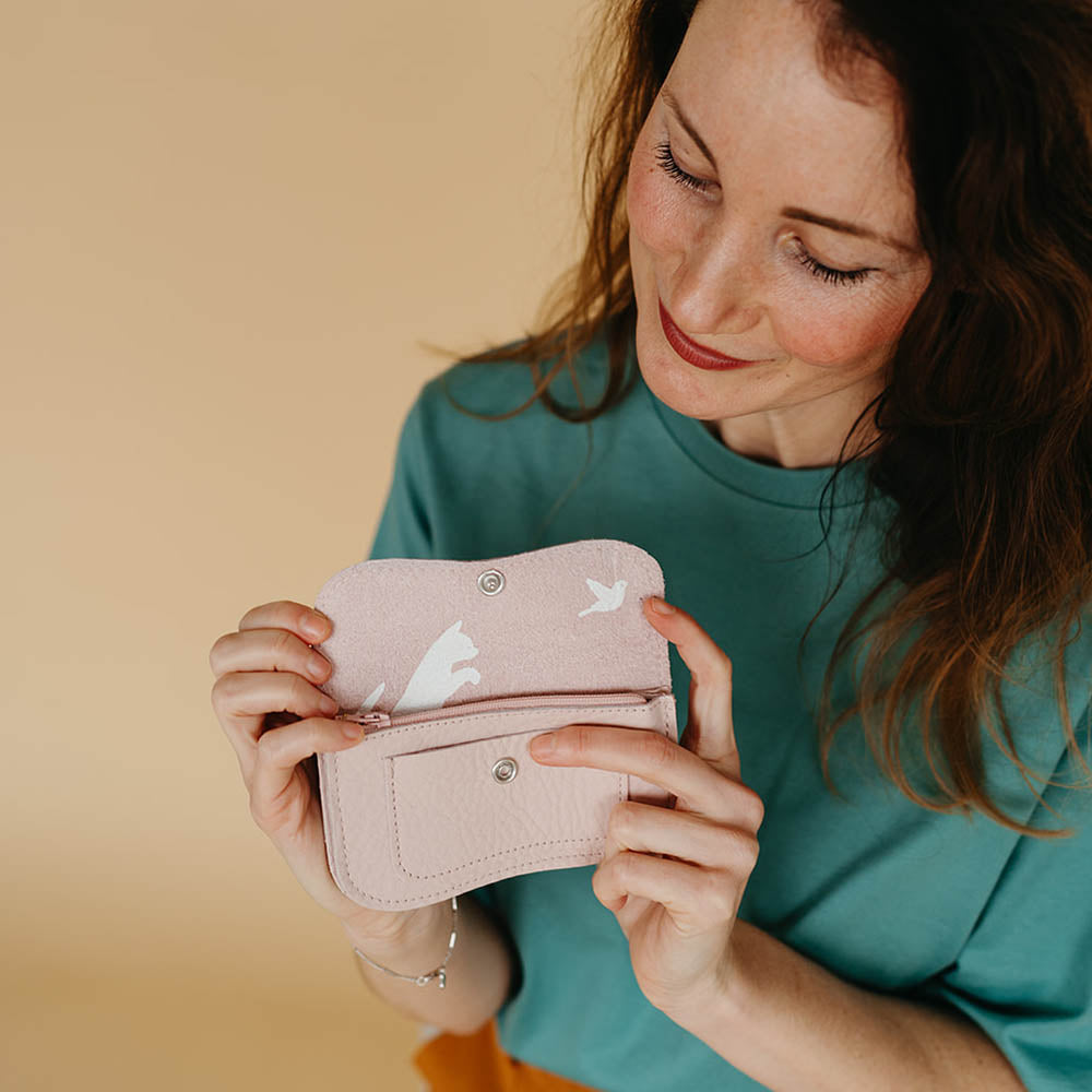 Ben je zo iemand die van alles in haar portemonnee bewaart? Het toegangsbewijs van een mooie tentoonstelling waar je geweest bent, pasfoto’s, een oude post-it met een lief berichtje... Nee? Dan is de Cat Chase small echt iets voor jou. Deze poeder roze leren portemonnee heeft precies voldoende vakjes om je briefgeld, muntgeld, rijbewijs en bankpas in op te bergen. Omdat je eigenlijk verder niets nodig hebt.