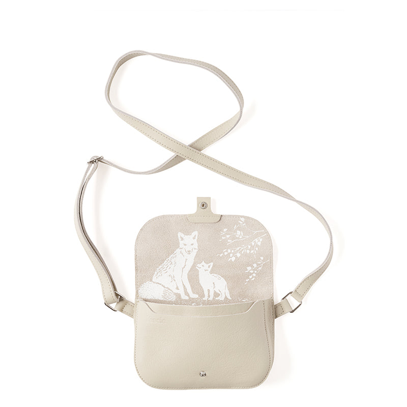 In dit beige leren crossbody tasje vind je een ruim hoofdvak en een extra vakje achterin, perfect voor je Mini Me portemonnee. Aan de voorkant zit nog een handig insteek vak over de hele breedte, perfect op maat voor je telefoon of sleutels. En de schattige zeefdruk van een vos en haar welp aan de binnenkant, maakt elke dag een beetje leuker. Echt een design leren damestas met een karaktervolle dierenprint.