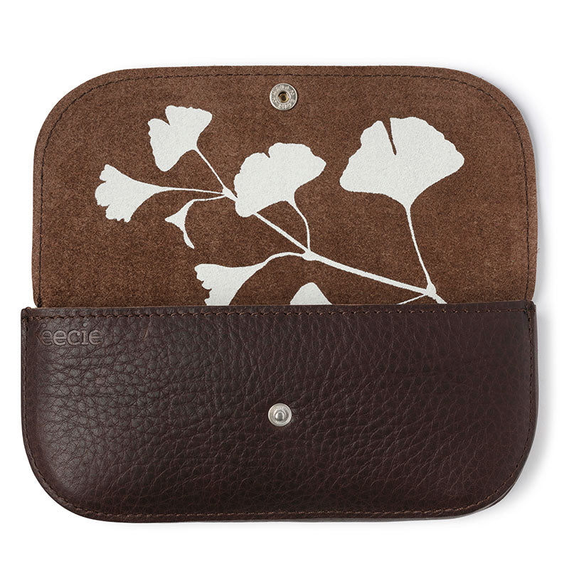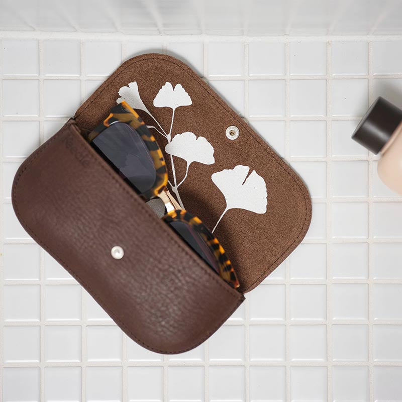 De voorkant is gemaakt van een dubbele laag leer, dus je zonnebril is goed beschermd. Aan de binnenkant vind je natuurlijk een zeefdrukprint. Dat is net dat extraatje waar Keecie om bekend staat. Dit keer hebben wij gekozen voor een print van het blad van een Ginkgo boom. In China en Japan is dit een heilige boom die geluk symboliseert.