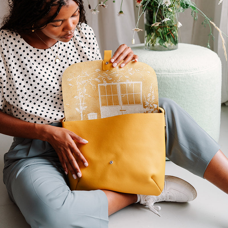 Ontdek onze Back Yard, een duurzame laptoptas van geel leer die functionaliteit en mode samenbrengt. Deze mooie damestas is meer dan een alleen accessoire, ze is je trouwe partner voor elk moment.