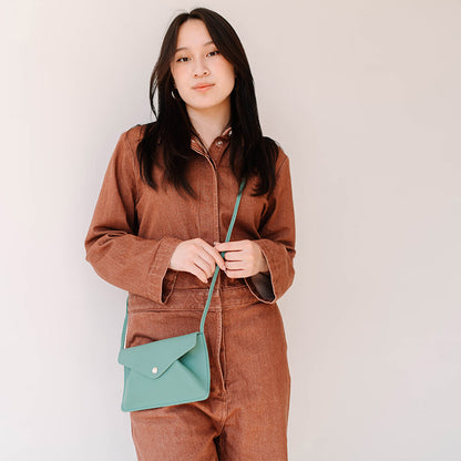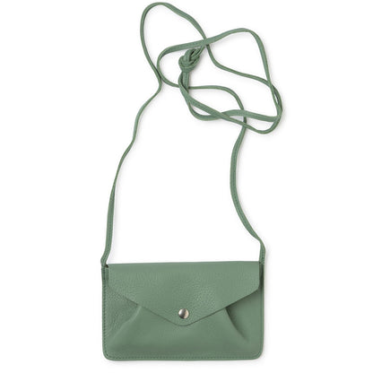 Deze leren envelop tas voor dames is niet alleen modieus maar ook ongelofelijk veelzijdig. De vergrijsde groene kleur is uniek en laat zich moeiteloos combineren met zowel pasteltinten als lichte kleuren. Gemaakt van hoogwaardig en duurzaam leer, is dit enveloptasje gebouwd om een leven lang mee te gaan.