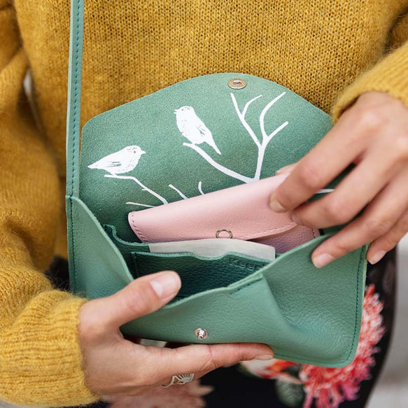 - aan de binnenkant van deze leren handtas voor dames zit de zeefdruk van een boom met drie nachtegaaltjes