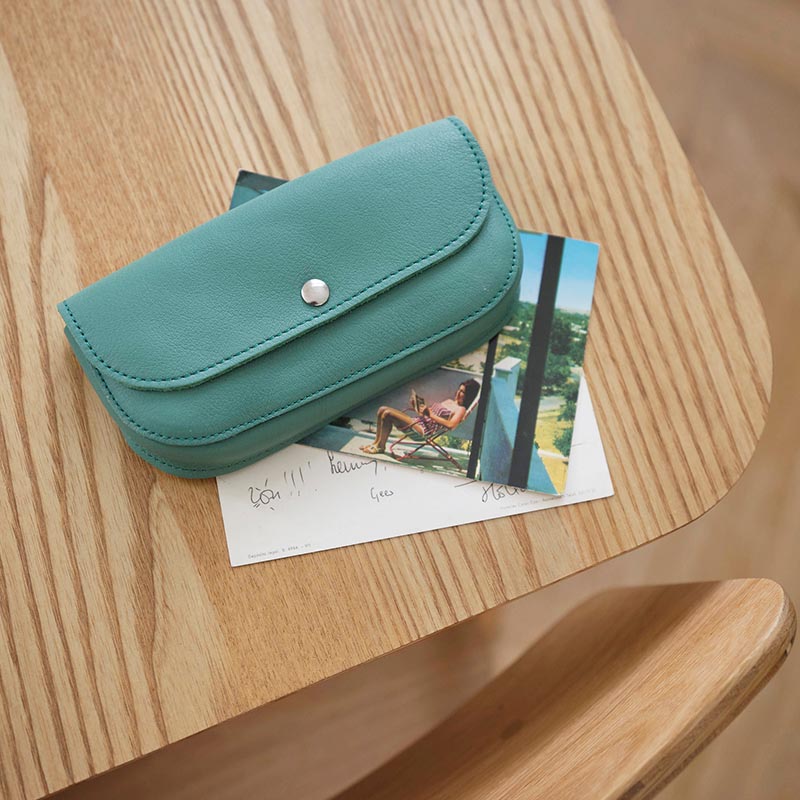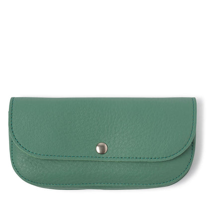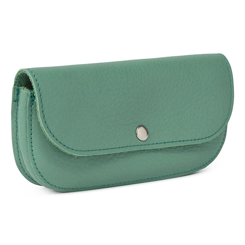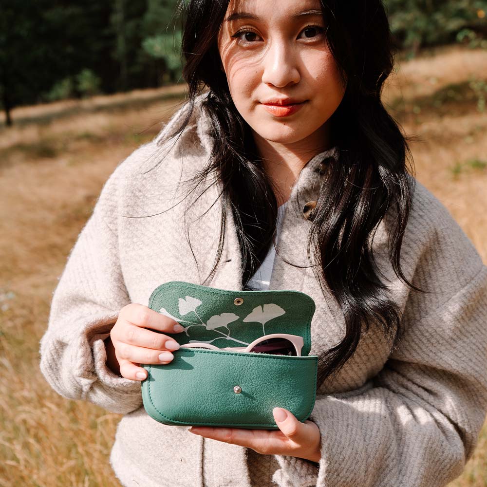 Met deze groene leren zonnebrilhoes kom je zonnig voor de dag. Écht een stijlvol item om mee te nemen naar het strand of een zonnig dakterras. En hij past perfect bij elke Keecie tas.