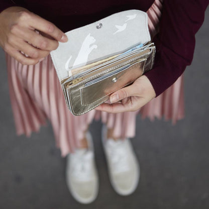 Het is een portemonnee waar je jaren plezier van zult hebben en de print aan de binnenkant, maakt haar het ultieme cadeau voor een poezenliefhebber. Ons atelier zeefdrukt de print met de hand, dus elk item is uniek! We denken ook aan het milieu en werken daarom met verf op waterbasis.