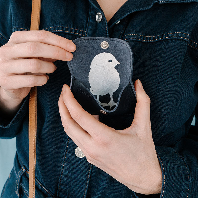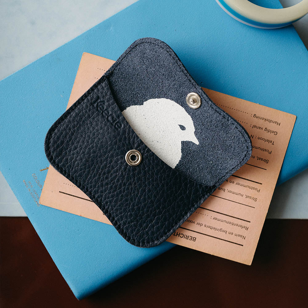 Wat de Mini Me zo bijzonder maakt, is de kenmerkende Keecie-print aan de binnenkant. Om het speelse karakter van deze zwarte leren pasjeshouder voor dames te benadrukken hebben we dit keer gekozen voor een zeefdruk van een schattig, maar eigenwijs kuikentje. De print is met de hand gedrukt in ons toegewijde familie-atelier in Polen, wat elke pasjeshouder uniek maakt.