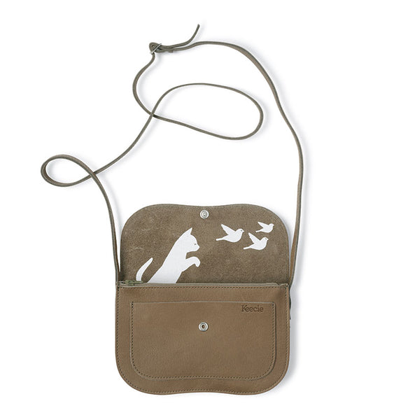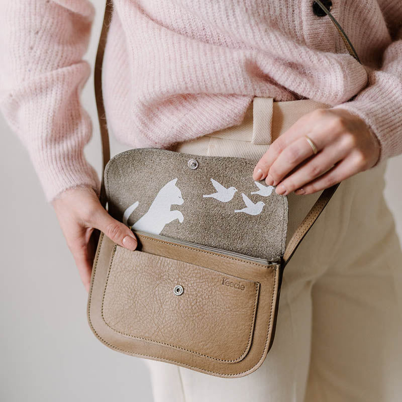 Dit is een tas waar je jarenlang plezier van zult hebben. Gemaakt van duurzaam Italiaans leer dat zo is behandeld dat het weinig onderhoud nodig heeft. Daarnaast kan het goed tegen de regen. Het water loopt zo van je tas af. De zeefdruk aan de binnenkant is geïnspireerd op Moos, de Keecie-kat, die overigens gelukkig niet dol is op vogeltjes. Dezelfde print vind je in onze Cat Chase portemonnees. Kijk bij de details voor de link.