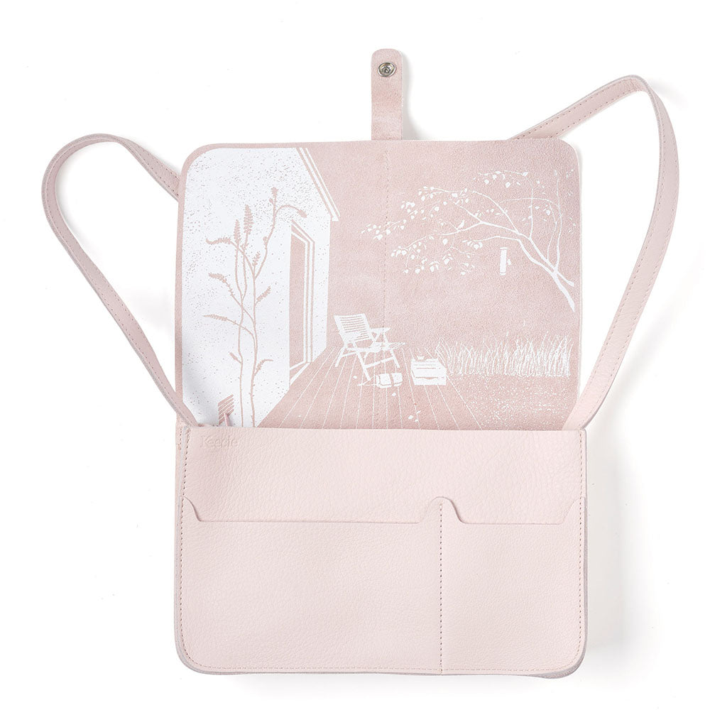 Met haar A5-formaat biedt deze modieuze lichtroze leren schoudertas voor dames genoeg ruimte voor je must-haves. Neem naast je sleutels, telefoon en make-up ook een magazine, notitieboekje of wat snacks mee voor onderweg - deze tas kan het allemaal aan. Zo heb jij altijd dat ene momentje voor jezelf bij de hand. Niet voor niets hebben we bij de Off Duty gekozen voor de zeefdruk van ons favoriete plekje in de tuin, waar we zo graag tot rust komen.