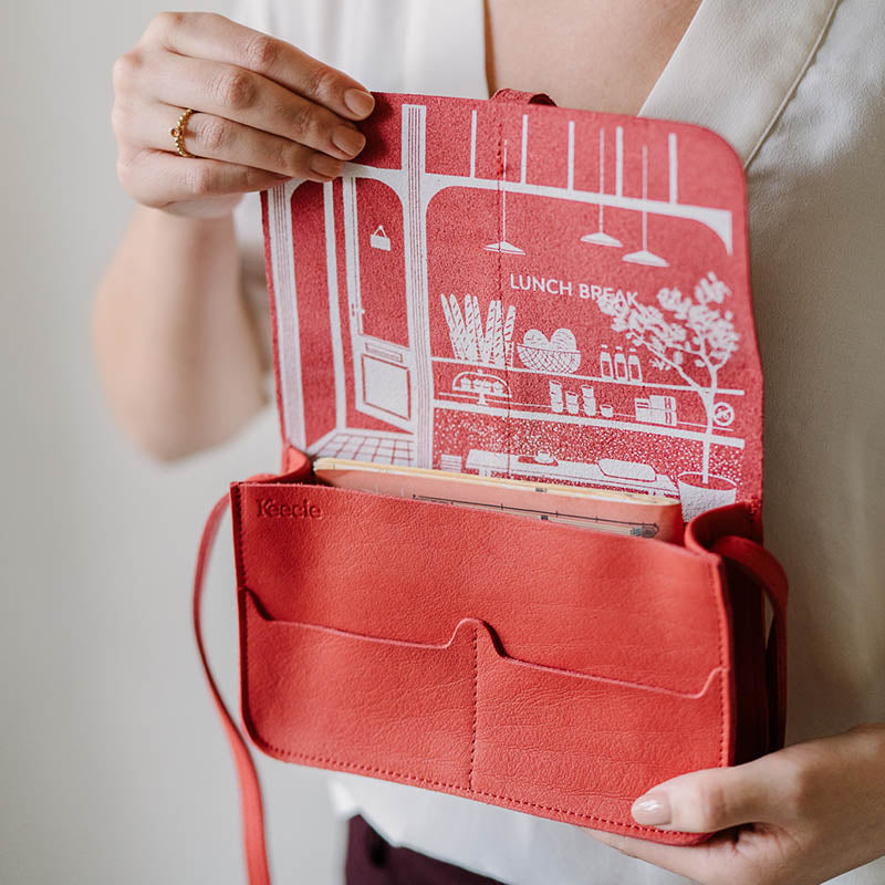 En alsof dat nog niet genoeg is, komt de zeefdruk aan de binnenkant door deze kleur ook goed naar voren. Bij dit duurzame schoudertasje van leer hebben we ons laten inspireren door ons favoriete lunchtentje voor de ideale pauze op een drukke dag.