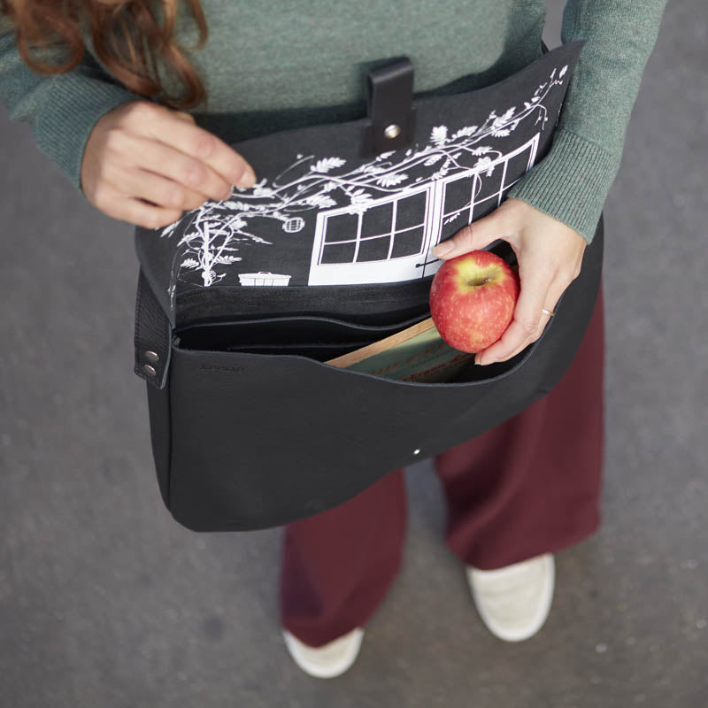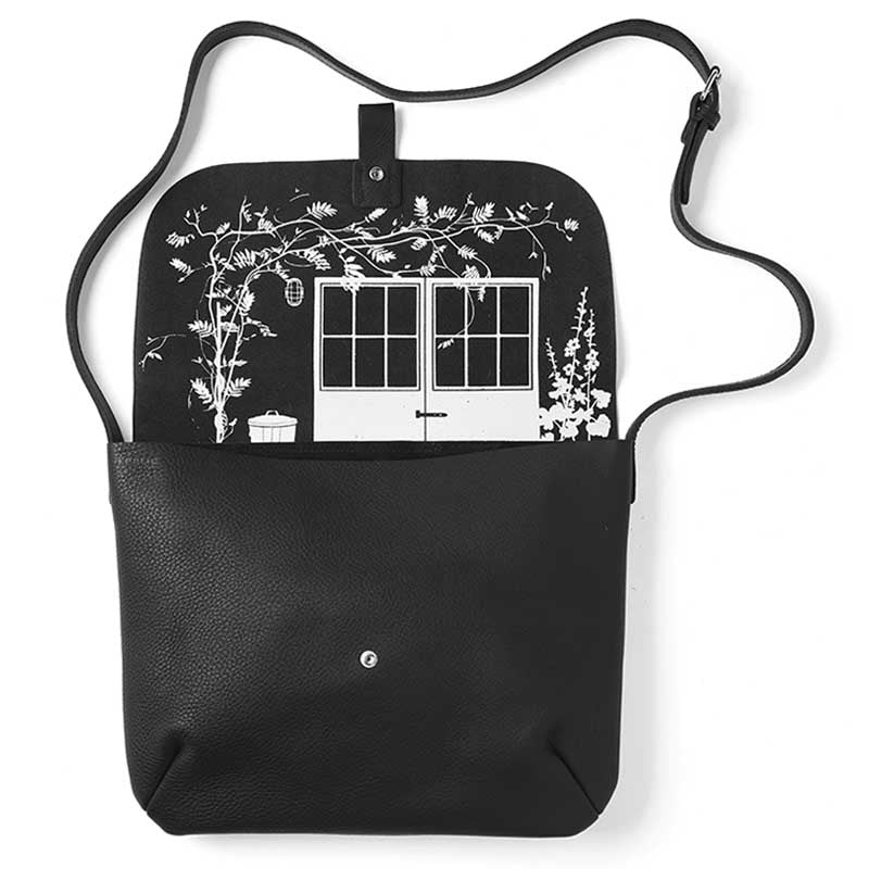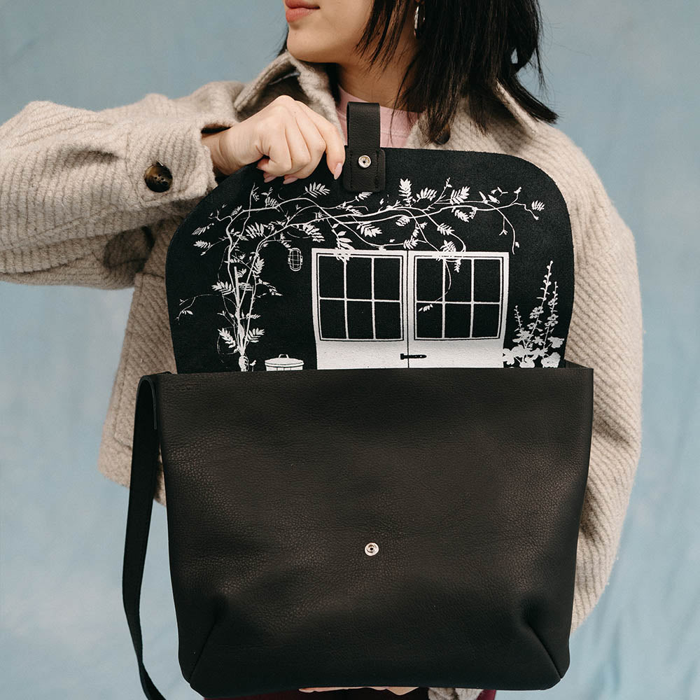 Ook de Back Yard heeft een kenmerkende Keecie-print aan de binnenkant van haar flap zitten. Bij deze leren laptop hoes voor dames hebben we ervoor gekozen onze gedroomde werkplek af te drukken. Zo heb jij je inspiratie altijd binnen handbereik, waar je ook bent. Op het zwarte leer van deze stijlvolle laptoptas voor dames komt de zeefdruk extra goed tot zijn recht.